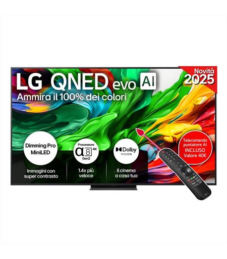 Dynamic QNED Color La tecnologia esclusiva di LG rende i colori ancora più intensi e realistici rispetto a un TV Ultra HD tradizionale. Questo TV è stato certificato da Intertek perché assicura il volume colore al 100%, che assicura sfumature più ricche e vivaci in ogni condizione di luminosità. Nuovo processore a8 Gen2 con AI Il processore a8 Gen2 sviluppato da LG è progettato per sfruttare il deep-learning dell'Intelligenza Artificiale per riconoscere ciò che stai guardando e migliorare automaticamente il suono e le immagini fotogramma per fotogramma. Ad esempio, analizza ogni fotogramma per migliorare la risoluzione, ridurre il rumore e, sul fronte audio, offrirti un suono surround virtuale fino a 9.1.2 canali. Tecnologia Dimming Pro con MiniLED Il processore a8 Gen2 controlla i MiniLED della retroilluminazione del TV in base a ciò che stai guardando. In questo modo le aree scure e quelle chiare godranno di un maggior contrasto che ti farà apprezzare ancora di più la visione dei tuoi contenuti. Telecomando Puntatore con AI Il rivoluzionario Telecomando Puntatore AI porta l'interazione con il tuo dispositivo a un livello superiore grazie alla presenza del nuovo tasto AI, che semplifica e accelera l'accesso alle funzioni più avanzate. Oltre ai comandi vocali, che permettono un controllo ancora più intuitivo, il telecomando offre anche la funzionalità drag & drop, che consente di navigare e spostare contenuti più facilmente. Schermo ultra-grande Con uno schermo così grande, potrai sentire un coinvolgimento ancora maggiore nei tuoi contenuti. Che si tratti di film, sport o giochi, il tuo intrattenimento non sarà mai più lo stesso. Immergiti in un mondo di colori vividi, immagini cristalline e dimensioni che ti fanno sentire parte della scena. Dolby Vision La tua sala cinema si arricchisce della migliore esperienza visiva targata Dolby. Il Dolby Vision regola infatti la profondità del colore scena per scena, dandoti colori più brillanti, un contrasto migliorato e un'esperienza più realistica. Il Dolby Vision è compatibile con molti servizi di streaming e videogiochi, offrendo un'esperienza visiva e di gioco più coinvolgente. Gaming di ultima generazione Giocare su un TV QNED con una console o un PC di nuova generazione significa godersi un gameplay più fluido e reattivo. Puoi giocare in 4K fino a 144fps, sfruttando anche la tecnologia VRR dell'HDMI 2.1 e l'AMD FreeSync Premium per eliminare i fastidiosi effetti ""tearing"" dell'immagine quando il frame rate del gioco non è costante. In più, quando colleghi una console da gioco il TV si imposta automaticamente nella modalità a bassa latenza, assicurandoti una risposta ai comandi più reattiva grazie alla disattivazione di tutte le elaborazioni superflue dell'immagine. LG AI Voice ID Quando accendi il TV, riconosce automaticamente la tua voce e imposta il tuo profilo per darti un'esperienza personalizzata. Ad esempio, ti consiglia nuovi contenuti da guardare in base alla tua cronologia di visione,... ...