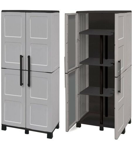 Armadio alto Linea Idea a 2 ante portascope con 3 ripiani interni dotati di doppio supporto per una portata maggiore e ganci porta scope interni per fissare i manici delle scope e di tutti gli altri oggetti per la pulizia con manico lungo. Mobile robusto e stabile grazie anche ai piedi centrali, è ideale per uso interno ed esterno su un terrazzo, balcone o in giardino. Essendo rialzato consente una facile pulizia sotto il mobile. Mobile per esterno in resina dotato di ripiani regolabili in altezza che consentono un’ottimizzazione dello spazio del mobile. L'armadio ha un sistema anti usura con cerniere in acciaio che garantiscono una chiusura a scatto, questo armadio è prodotto in polipropilene: materiale antiurto resistente al freddo, alle intemperie, oli e solventi Manutenzione semplice e veloce, può essere lavato tranquillamente, non assorbe odori e nè trattiene l’umidità. Questo modello di armadietto è ottimo per ogni tipo di arredo per esterno, è dotato di un semplice sistema di ...