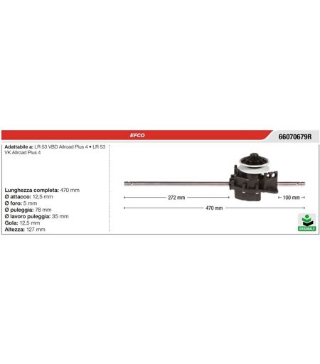 TRASMISSIONE TRAZIONE SEMOVENZA per rasaerba tosaerba SERIE LR 53 VBD ALLROAD PLUS LR 53 VK ALLROAD PLUS 4 LUNGHEZZA COMPLETA: 470 mm Ø ATTACCO: 12.5 mm Ø FORO: 5 mm Ø PULEGGIA: 78 mm Ø LAVORO PULEGGIA: 35 mm GOLA: 12.5 mm ALTEZZA: 127 mm Codice : 66070679R Codice Originale: COMPATIBILE ANCHE CON OLEOMAC G 53 VBD ALLROAD PLUS 4 G 53 VK ALLROAD PLUS 4 (K800) AT ...