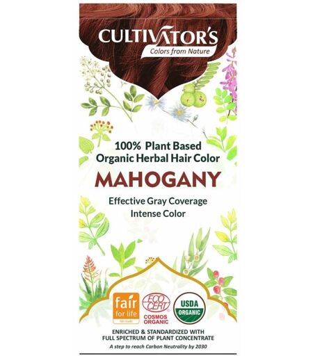 Cultivator's Mahogany Tinta Vegetale Biologica è una miscela di erbe accuratamente scelte con proprietà coloranti e curative. Questa Tinta Vegetale non altera l'equilibrio naturale dei capelli, copre completamente i capelli bianchi con una tonalità Rosso Mogano. La Tinta vegetale Mahogany di Cultivator's è una miscela di erbe Biologiche con proprietà coloranti e curative. Questa tintura ristruttura e rivitalizza i capelli, gli dona corpo e lucentezza; La tonalità ottenuta con l'utilizzo della miscela Mahogany è una colorazione vivace e naturale Rosso Mogano. La tinta vegetale Cultivator's è una tintura per capelli in polvere idrosolubile ottenuta da miscele vegetali naturali. Non contiene ingredienti di sintesi. Non è testata su animali. Modo d'Uso: Lavare i capelli con uno shampoo preferibilmente biologico. Aprire i pacchetti ed aggiungere acqua calda a 35° alla polvere, mescolare fino ad ottenere un composto cremoso. Applicare immediatamente il composto in maniera uniforme sui capelli. Avvolgere e coprire i capelli con la cuffia in dotazione. Lasciare in posa da 60 a 90 minuti, a seconda della tonalità desiderata; 60 minuti per una tonalità più chiara e 90 minuti per una tonalità più scura. Risciacquare con acqua. INCI: Lawsonia Inermis (Henna) Leaf Powder*, Indigofera Tinctoria (Indigo) Leaf Powder*, Emblica Officinalis (Amla) Fruit Powder*, Ziziphus Spina-Christi (Ziziphus) Leaf Powder*, Eucalyptus Globulus (Eucalyptus) Leaf Powder*, Aloe Barbadensis (Aloe Vera) Leaf Powder*, Curcuma Longa (Turmeric) Root Powder*, Matricaria Recutita (Chamomile) Flower Powder*, Rubia Cordifolia (Manjistha) Stem Powder* * ingredienti da agricoltura biologica. ...