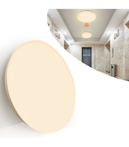 Deckenleuchte mit Bewegungssensor und integriertem LED Modul (kein zusätzliches Leuchtmittel nötig). Sensor - HF-Sensor (Mikrowellensensor), 5.8GHz CW Radar, ISM Band • Erfassungsbereich 360°, 1-5m Radius, Erfassungsbereich und Leuchtdauer einstellbar, Lichtempfindlichkeit 5-2000 LUX, Installationshöhe 2-4m. 12W LED Deckenleuchte mit integriertem Hochfrequenz Bewegungsmelder. Intelligentes Licht für Flur, Treppenhaus, Badezimmer, Keller, Garage und viele andere Orte. Dank der Schutzart IP44 auch im Feuchtraum anwendbar. Technische Daten: Leistung: 12W Spannung: 85V-265V 50HZ Farbe: Warmweiß (2700K-3200K) Dimmbar: Nein Leuchtkraft:1400LM Standby-Leistung: ≤ 0,5W Verlängerte Zeit: 30 Sekunden Erfassungsbereich: ≤ 5 Meter Einbauhöhe: ≤ 5 Meter Modus: die ganze Lampe aus, nachdem die Leute vobeigegangen haben Abstrahlwinkel:120° Energieeffizienzklasse: A++ Größe:φ240*60MM Schaltzyklen: 15.000 Lebensdauer in Stunden: 50.000 Std. Anlaufzeit: ...