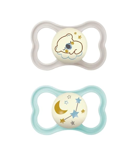Box con due ciucci ortodontici progettati per ridurre il rischio di malocclusioni dentali, si illuminano di notte. Con fori di ventilazione extralarge. Dai 16 mesi in poi. ...
