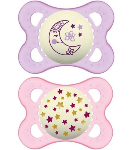 MAM Night - Succhietto 2 - 6 m - Silicone doppio femmina - Descrizione Ciuccio che si illumina al buio, facile da trovare grazie al bottone luminescente. Cod. ZEDMM040F ...