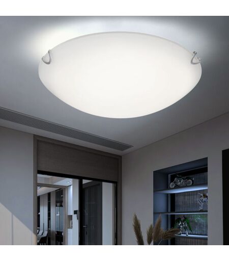 Descrizione La tradizionale lampada da soffitto classica, rotonda (Ø30 cm), colpisce per il suo design senza tempo. Una luce bianca calda da 930 lumen e 3500K filtra attraverso il vetro satinato, esaltandone piacevolmente il design. Che si tratti del soggiorno o della camera da letto, questa lampada da interni può essere utilizzata in diversi ambienti grazie al suo stile neutro. La sorgente luminosa è installata in modo permanente nella lampada. Dettagli della luce • Tipo di lampada: Lampada da soffitto• Materiale: Metallo, bianco • Paralume: Vetro, satinato• Classe di protezione: IP20 • Diametro x altezza in cm: 30 x 7 • Sorgente luminosa: 1 LED• Sorgente luminosa inclusa: Sì• Potenza della sorgente luminosa: 1 x 16 Italiano: Watt• Flusso luminoso: 1x 930 lumen• Colore della luce: bianco caldo• Alimentazione: 220-240 V, 50-60 Hz Dettagli della sorgente luminosa • Tipo di sorgente luminosa: LED • Flusso luminoso: 930 lm (lumen) • Consumo energetico: 16 kWh/1000 h • Temperatura colore: ...