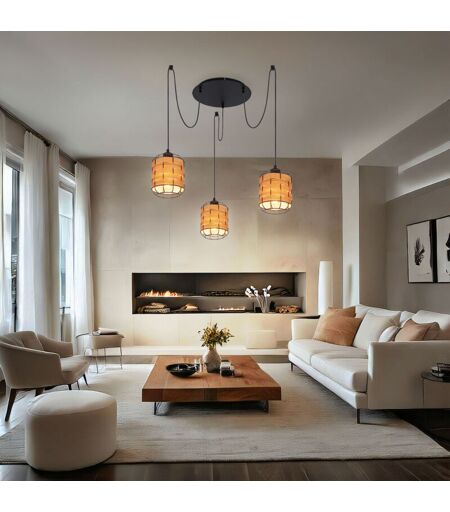 Descrizione Questa fantastica lampada a sospensione colpisce per il suo bellissimo design e diventa il centro della tua stanza. Da tre cavi tessili neri opachi, regolabili in altezza, con una lunghezza massima di 2 m, sporge una presa E27, che può essere equipaggiata con una lampada a scelta, fino a una potenza massima di 40 Watt. Le prese E27 sono racchiuse ciascuna in un'attraente gabbia/paralume rotondo in metallo con inserti in plastica, conferendo alla lampada il giusto tocco. Le lampadine non sono comprese nella fornitura. Lampada dettagli • Tipo di lampada: lampada a sospensione • Materiale: metallo, plastica • Colore: nero, marrone, aspetto legno • 3 fiamme • Grado di protezione: IP20 • Diametro x altezza in cm: 38,5x200 • Numero di prese: 3x E27 • Lampadine incluse: no • Potenza lampada: massimo 3x 40W • Alimentazione: 230V, 50Hz ...