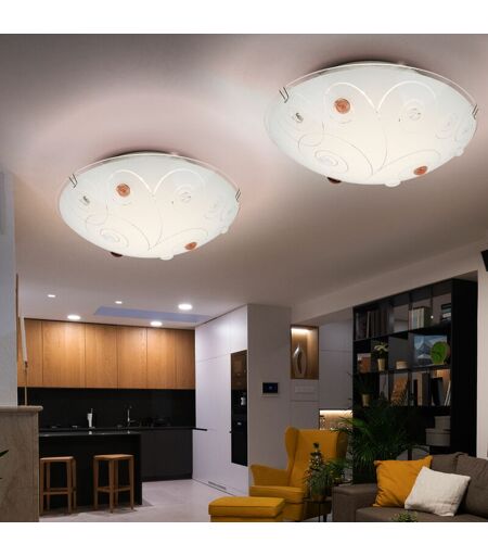 Descrizione Lampada da soffitto classica: la soluzione ideale per quasi ogni stanza e stile di vita! Non puoi sbagliare con questa luce. Realizzata in vetro cromato e opalino di alta qualità, questa lampada colpisce soprattutto per la sua applicabilità universale. Che sia in cucina, in corridoio, in soggiorno o in bagno, grazie alla sua forma e linea classica, questa plafoniera è ovunque la soluzione ideale. Una sorgente luminosa LED da 8 Watt di alta qualità è già integrata. Nella consegna sono incluse due plafoniere! Lampada dettagli • Tipo di lampada: plafoniera • Materiale: cromo, vetro • Paralume: Opale con linee decorative e pietre decorative• Grado di protezione: IP20 • Diametro in cm: 25 • Sorgente luminosa: 1x LED• Lampadine incluse: sì• Potenza lampada: 1x 8 watt • Colore della luce: bianco caldo• Lampadina flusso luminoso: 640 lumen • Alimentazione: 230V, 50-60Hz Dettagli lampadine • Tipo di lampadina: scheda LED • Consumo energetico: 8 kWh/1000h • Consumo energetico ...