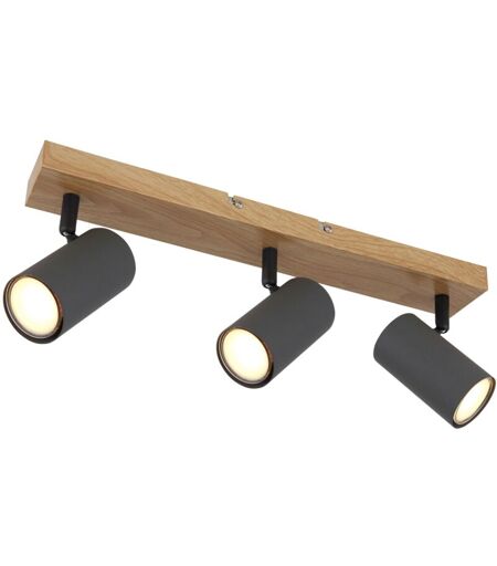 This simple spotlight of the Robby series inspires with design and coloring. On a rectangular ceiling bracket in wood design (41x6cm) there are three GU10 sockets, each covered by a cylindrical shade in matt graphite. The GU10 socket, allows you to freely choose bulbs, up to a maximum power of 35 watts. ...