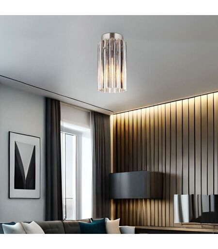 Descrizione Questa elegante plafoniera in nichel opaco e vetro chiaro e satinato colpisce per il suo design semplice e moderno. Il paralume cilindrico in vetro assicura una distribuzione uniforme della luce e crea un ambiente piacevole e accogliente. La combinazione di metallo freddo e vetro trasparente crea un elegante contrasto che si integra armoniosamente in vari stili di arredamento. Con un'altezza di 21 cm e un diametro di 11,5 cm, la lampada ha un design compatto ed è ideale per ambienti con soffitti di altezza limitata, come corridoi, cucine o camere da letto. Grazie ai materiali di alta qualità e alla lavorazione precisa, questa plafoniera offre una soluzione di illuminazione durevole e affidabile. Il vetro semplice e trasparente lascia trasparire la luce in modo discreto, creando un'atmosfera piacevole e calda. Montata singolarmente o in combinazione con più unità, questa plafoniera crea accenti di luce eleganti e colpisce per la sua funzionalità e il suo design moderno. ...