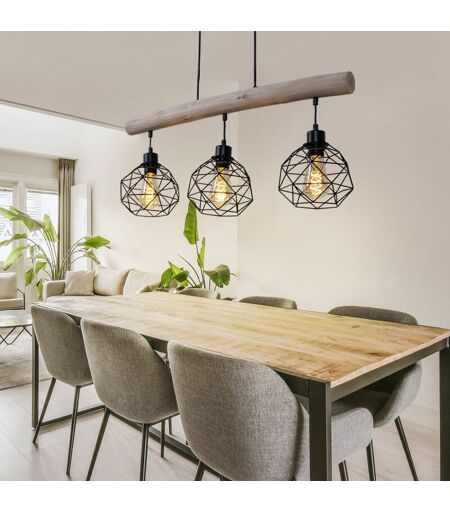 Globo Luce a sospensione Luce a sospensione in legno Luce a sospensione per sala da pranzo vintage, design retrò a 3 fiamme, griglia metallica natura legno