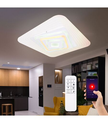 Descrizione Con questa moderna plafoniera a LED (50 x 50 cm) porti l'high-tech nelle tue quattro pareti. Dotato di una funzione di memoria, un cambia colore e un telecomando, non lascia nulla a desiderare. Il clou, tuttavia, è la funzione Smart Home, la luce è compatibile con Smart Home e Alexa e può essere azionata tramite input vocale. La luce oggetto ha anche tramite un circuito LED da 40 watt con una durata di 20.000 ore. Questa lampada Smartlight è facile da usare utilizzando l'app Tuya Smart (Android TM/IOS). Questa plafoniera è dimmerabile e il colore della luce può essere regolato tramite un telecomando (3000K-6500K). Il controllo vocale è facile con Amazon Echo Tm e Google Home. Una lampadina a LED e un telecomando sono inclusi nella fornitura. Dettagli luminosi • Tipo di lampada: plafoniera • Materiale: metallo, acrilico • Colore: bianco • dimmerabile • telecomando • Funzione memoria • Funzione luce notturna • Cambio colore/fissazione• Controllo app• Controllo vocale • ...
