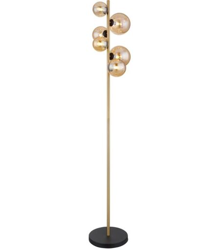 This fascinating floor lamp of the RIha series convinces with great design. From a round black matt base protrudes an approx. 1.6m large metal rod in beautiful brass, equipped with six differently sized G9 LED lamps and each a glass shade in amber. The G9 LED bulbs emit a 3000 Kelvin warm white light and thus create a pleasant atmosphere. With other models of this series you can perfectly complement your living area. ...