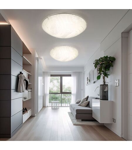Descrizione La raffinata lampada da soffitto colpisce per il suo materiale e il suo aspetto accattivante. Il vetro decorativo satinato con cristalli K9 offre una luce speciale. La plafoniera rotonda (Ø25 cm) fornisce 500 lumen di luce con una colorazione della luce bianca calda 3000K. Una sorgente luminosa a LED è installata in modo permanente nella lampada. Nella consegna sono incluse due luci! Lampada dettagli • Tipo di lampada: plafoniera • Materiale: cromo • Paralume: vetro satinato • Forma: rotonda • Vetro con decoro • Diametro x altezza in cm: 25x8 • Presa: 1x LED • Lampade installate permanentemente • Potenza lampada: 1x 8 watt • Flusso luminoso: 1x 500 lumen • Colore della luce: bianco caldo • Tensione di funzionamento: 230 V, Hz Dettagli lampadine • Tipo di lampadina: LED • Flusso luminoso: 500 lm (lumen) • Consumo energetico: 8 kWh/1000h • Temperatura colore: 3000K (Kelvin) • Colore della luce: bianco caldo • Consumo energetico nominale: 8 W (watt) • Durata utile nominale: ...