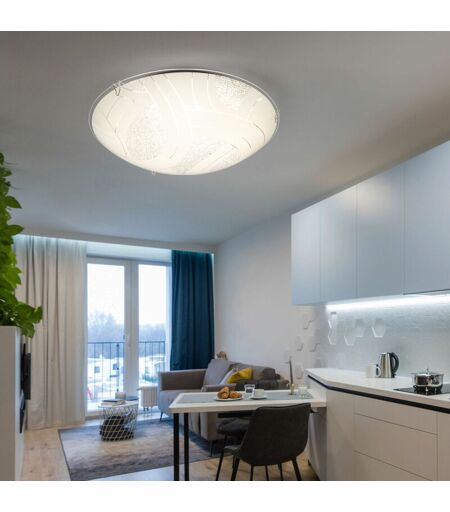 Descrizione La raffinata lampada da soffitto colpisce per il suo materiale e il suo aspetto accattivante. Il vetro decorativo satinato con cristalli K9 offre una luce speciale. La plafoniera rotonda (Ø25 cm) fornisce 500 lumen di luce con una colorazione della luce bianca calda 3000K. Una sorgente luminosa a LED è installata in modo permanente nella lampada. Lampada dettagli • Tipo di lampada: plafoniera • Materiale: cromo • Paralume: vetro satinato • Forma: rotonda • Vetro con decoro • Diametro x altezza in cm: 25x8 • Presa: 1x LED • Lampadine incluse: sì (installate in modo permanente) • Potenza lampada: 1x 8 watt• Flusso luminoso: 1x 500 lumen • Colore della luce: bianco caldo • Tensione di funzionamento: 230 V, Hz Dettagli lampadine • Tipo di lampadina: LED • Flusso luminoso: 500 lm (lumen) • Consumo energetico: 8 kWh/1000h • Temperatura colore: 3000K (Kelvin) • Colore della luce: bianco caldo • Consumo energetico nominale: 8 W (watt) • Durata utile nominale: 20.000 h (ore) • ...