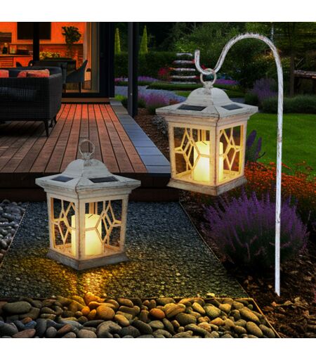 Descrizione Questa lampada solare darà al vostro giardino quel qualcosa in più. Il suo design un po' cupo e rustico crea un'atmosfera unica. La base in plastica bianca, ricurva all'estremità, sostiene una piccola lanterna in plastica trasparente che lascia trasparire una luce piacevole. Con un grado di protezione IP44, la lampada, alta 68 cm, è adatta anche all'uso esterno. Particolarità: lampada da tomba, da appoggio o da appendere, con picchetto a terra. La fornitura comprende due lampade! Dettagli della lampada • Tipo di lampada: lampada solare • Materiale: plastica, metallo • Colore: bianco • Grado di protezione: IP44 • Batteria ricaricabile: 1x Ni MH AA 300mAh 1.2V• Altezza della lampada in cm: 23 • Lunghezza x larghezza x altezza in cm: 21x14,3x31 (senza picchetto di terra) • Peso: 0,6 kg • Attacco: 1x LED • Lampadina inclusa: Sì • Lampadina LED: 1x 0,06 watt • Tensione: 3,2 Volt ...