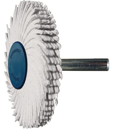 Le spazzole rotanti SUNBURST di TYROLIT sono la soluzione ideale per la sbavatura leggera, la pulizia, nonché per lavorazioni di finitura e lucidatura su una vasta gamma di materiali, in particolare per le zone difficili da raggiungere. Rimuovono sottili strati dalla maggior parte delle superfici senza danneggiare lo strato sottostante. La produzione di calore e di polvere è minima. Grazie al sistema di montaggio con albero, sono pronte all’uso su smerigliatrici lineari. La grana abrasiva affilata, incorporata nelle setole sottili e flessibili, permette una finitura rapida e uniforme. Per la maggior parte delle applicazioni, la velocità di lavoro si aggira tra 8.000 e 10.000 giri/min. Velocità inferiori consentono un approccio più delicato, maggiore flessibilità e risultati più fini. Velocità più elevate permettono un asportazione più aggressiva del materiale. Premere leggermente le setole massimizza la durata delle spazzole. Ø dell’albero 6 mm ...