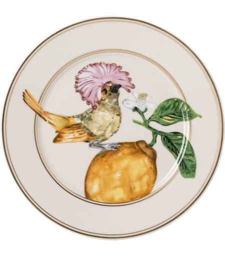 Realizzato con eleganza e ispirato alla natura, questo piatto da pane Idyllia marshmallow presenta un maestoso acchiappamosche reale appollaiato su un limone. Realizzato in collaborazione con il brand di porcellane Rosenthal, il motivo è stampato utilizzando una tecnica esclusiva che cattura l’essenza e la radiosità dei cristalli. È ulteriormente decorato con sottili linee in tonalità oro per uno splendido tocco finale. Questo piatto da pane è lavabile in lavastoviglie, ma non adatto all’uso nel microonde. ...