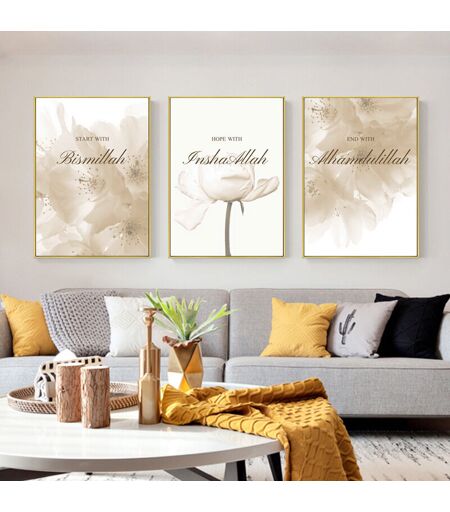 Toile de haute qualité : matériau non tissé de haute qualité, impression à l'encre imperméable, texture claire, lignes lisses et naturelles, décoration de salon islamique Pas de cadre : Islamic Mural - Le set affiche ne contient pas de cadre et nos produits sont livrés avec une lame de 3 à 5 cm. Vous pouvez choisir un cadre dans un style similaire en fonction de votre fond mural et de votre style de salon Décoration polyvalente : peintures de calligraphie islamique pour le salon, la chambre à coucher, peuvent également être utilisées pour la décoration murale dans les cuisines, les hôtels, les salles à manger, les bureaux, les salles de dortoir, les bars, les salles de classe, etc. Superbe cadeau : offrez à vos amis ou votre famille, vos collègues comme surprise de vacances ou un cadeau émouvant avec des affiches islamiques. Superbe décoration murale qui exprime votre bénédiction et vos souhaits Veuillez noter que les couleurs réelles peuvent être légèrement différentes de celles de ...