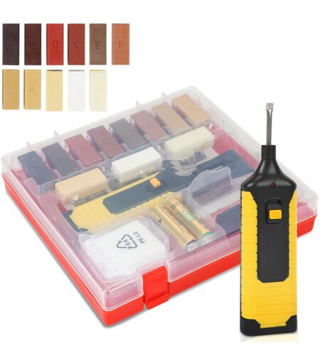 Rimuove facilmente graffi superficiali e profondi. Corregge le irregolarità su tutte le superfici in legno (come laminato. parquet o sughero). È adatto anche per porte. finestre e ringhiere. Facile da usare: Il fusore viene riscaldato per liquefare la cera dura e quindi i graffi vengono riempiti di cera. Dopo che la cera si è indurita. è possibile utilizzare un coltello per piallare e una spugna per rimuovere i punti irregolari. Kit per la riparazione di pavimenti in legno comprendente fonditore di cera. coltello per piallare. 2 spatole. 11 cere dure. spugna per levigare. panno per la pulizia. batterie. custodia. È possibile scegliere un totale di 11 colori. È possibile mescolare i colori per ottenere l'effetto desiderato. Dopo l'indurimento. la cera è durevole e resistente all'abrasione Kit di riparazione per pavimenti in parquet Adatto anche per: Riparazione di piastrelle. pavimenti in laminato. pavimenti in legno duro. tutti i tipi di pavimenti in legno.Perfetto per gli amanti del ...