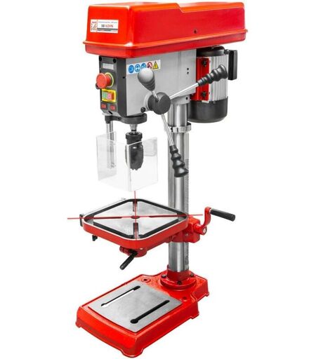 TRAPANO A COLONNA HOLZMANN SB162VN Con laser di centraggio e luce di lavoro Tavolo da lavoro allungabile Velocità Vario con display LCD Dispone di una base solida e lucidata con dadi a T Motore in alluminio secondo IP54 Colonna in acciaio resistente alla torsione, solida e lucidata Il piano di lavoro è inclinabile da -45 ° a + 45 ° e ruota di 360 ° attorno al centro del tavolo e alla colonna. Coperchio di protezione del mandrino Arresto della profondità di foratura regolabile con scala per un controllo preciso della profondità di foratura Incluso: mandrino automatico 1-16mm, B16 Caratteristiche tecniche: Potenza motore s6 in W: 500 W Tensione: 230 V / 50 Hz Velocità in min-1: 390-2200 Classe di protezione: I Sbraccio in mm: 150 Dimensioni della tavola in mm: 243x243 Dimensioni totali in mm: 310x570x910 Max. prestazioni di perforazione in mm: 16 Adattatore per fresatura: MK2 / MT2 Diametro della colonna in mm: 60 Corsa mandrino in mm: 90 Base in mm: 413x246 Base distanziatrice in mm: ...