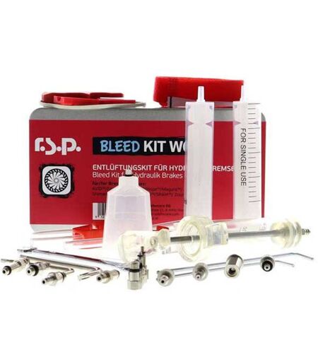 Kit di spurgo RSP per freni idraulici.Diverse opzioni, kit specifici per un tipo di freni o quello per uso professionale valido per la maggior parte dei freni.Kit di spurgo TALLER RSP per uso professionale, valido per lo spurgo e il riempimento del liquido nei seguenti marchi di freni a disco idraulici:- Ávid, Formula, Hayes, Hope, Magura, Shimano Mtb e Road, Tektro, SRAM, Zoom.Il kit include:- 2 siringhe + 1 siringa professionale- distanziali pistone- 1 chiave fissa- 4 chiavi Allen- 1 imbuto- connettori- guantiIl kit Shimano include:- 2 siringhe- 1 distanziale pistone- 1 chiave- 1 chiave Allen- 1 imbuto- connettori- guantiIl kit Magura include:- 2 siringhe- 1 chiave Allen- connettori- guanti- connettori- guanti ...