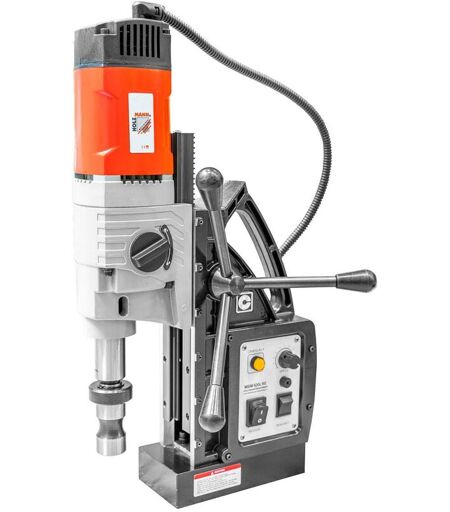 Per fori centrali e filettati. Ideale per la lavorazione di pezzi in acciaio di grandi dimensioni ed ingombranti laddove trapani convenzionali risultino inadeguati. Consente la lavorazione mobile di pezzi con una guida precisa. Adatto anche per fori verticali. Attivando l'elettromagnete il trapano può essere attaccato a qualsiasi parte in acciaio e in qualsiasi posizione. Adatto anche per lavori dall'alto - il magnete fornisce la sicurezza necessaria. Ampiamente usato in edilizia, nella costruzione di ponti e nelle costruzioni navali. Il dispositivo offre la rotazione a destra e a sinistra, velocità regolabile, controllo di velocità e filettatura. Caratteristiche tecniche: Motore: 2080 W 230 V / 50 Hz Velocità mandrino: 90-225 / 160-405 min-1 Corsa del mandrino: 210 mm Max. profondità di foratura: 50 mm Mandrino: ø 23 mm CM:3 Weldon Max. foro svasato: 32 mm Forza magnetica: 15000 N Base magnetica: 205 x 107 x 68 mm Dimensione filettatura: M18 Fresa a carotatrice max.: 60 mm Distanza ...