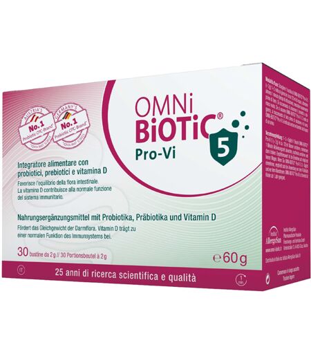 OMNi BiOTiC - Pro - Vi 5 - Descrizione Integratore alimentare con probiotici prebiotici e vitamina D. Favorisce l'equilibrio della flora intestinale. La vitamina D contribuisce alla normale funzione del sistema immunitario. Con cinque ceppi probiotici vivi ed attivi naturalmente presenti nell'int… ...