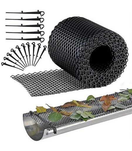 SHINING HOUSE Rete di protezione per grondaie, rete di drenaggio da 6 m x 15 cm con 10 ganci di fissaggio, protezione per grondaie in rete nera, tagliabile a