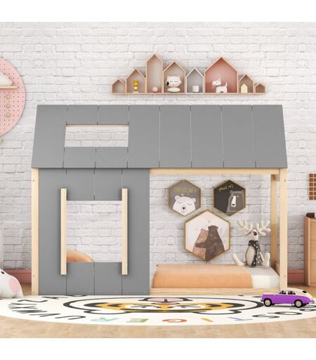 WISHDOR Letti a casetta per bambini 90 x 200 cm con tetto e finestra, naturale e grigio chiaro