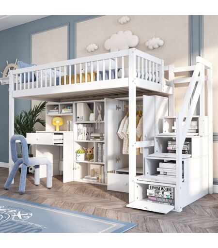 MODFU Letti a soppalco 90x200cm letti singoli per bambini con scrivania, mobile contenitore, guardaroba, scale con funzione contenitore, legno e mdf, senza