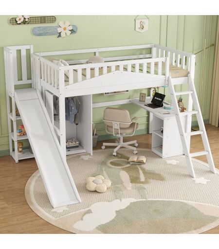 HAUSS SPOLE Letti a soppalco 90x200cm, letto a castello per bambini con tavolo e armadio, senza materasso, bianco