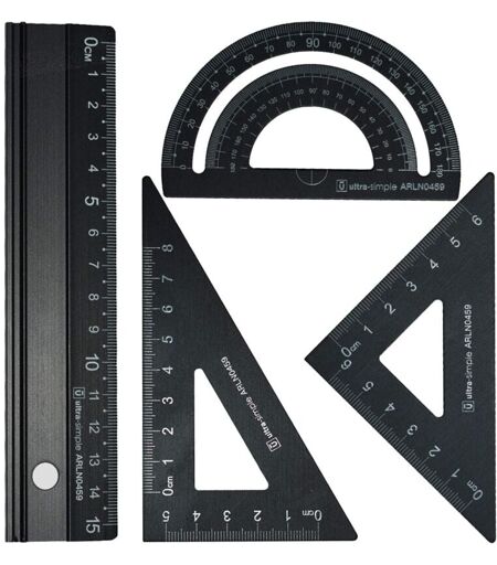 Set di 4 righelli in alluminio per geometria, per matematica, disegno, progettazione, studio/esame, ecc. Design antiscivolo: facile da usare, design unico per proteggere le dita evitando lo scivolamento Un set di righelli: 1 righello da 15 cm, 1 righello triangolare da 30°/60°, 1 righello triangolare da 45/90° e 1 goniometro Colore: nero DUREVOLE: realizzato in alluminio puro, il righello triangolare è resistente, leggero e affidabile ...