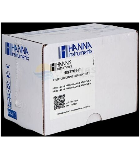 Il kit di reagente liquido Hanna per la determinazione del livello di cloro libero viene fornito in scatole con 3 bottiglie da 20 ml. reattiva A e 3 bottiglie da 20 ml. reattiva B. Con un singolo kit è possibile eseguire fino a 300 test. Particolarmente indicato per l'uso nei seguenti fotometri Hanna e minifotometri: • HI97701, HI97710, HI97711, HI971044, HI97734, HI97745, HS94104C, HI97101. Può anche essere smaltito di reagente di polvere solida per la determinazione del cloro libero. ...