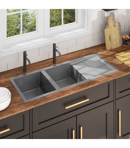 Godetevi il vantaggio del nostro lavandino di fascia alta con design pulito e contemporaneo. Le vasche con finitura satinata liscia come la seta trasuderanno classe e raffinatezza, che si adatteranno a qualsiasi arredamento della cucina! Combinando il meglio in termini di funzionalità e design, questo lavello a due vasche è realizzato in acciaio inossidabile lavorato a mano di alta qualità con vernice anticondensa, antimuffa, senza piombo e resistente alla corrosione. È insonorizzante, con pad di riduzione del suono. Lo sgocciolatoio tornerà molto utile non solo quando si lavano i piatti a mano, ma anche come spazio extra per tagliare le verdure. Inoltre, la vasca con un esclusivo design a X-flume facilita il flusso rapido, prevenendo l'acqua stagnante sul fondo della vasca. Il lavandino da cucina è facile da montare. L'acciaio inossidabile lavorato a mano può essere montato sottopiano, ad incasso o drop in e potete scegliere di montarlo nel modo desiderato. Colore: argento Materiale: ...