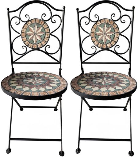 Coppia sedie Morgana. Informazioni principali: - Con struttura in metallo verniciato. - Ripieghevoli. - Decorazione in mosaico simil pietra su schienale. - Dimensioni cm 38x90 h. ...