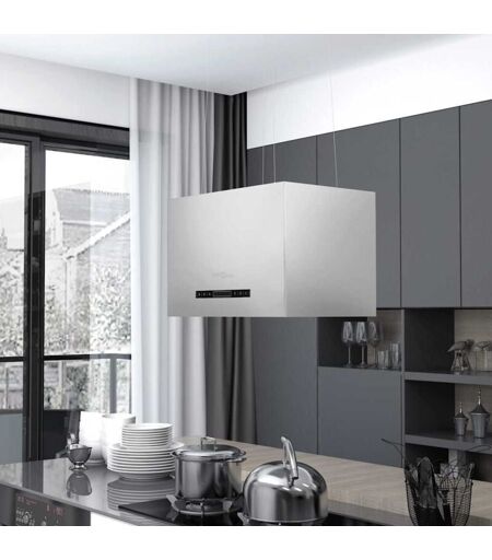 La nostra cappa a isola sospesa silenziosa e potente è l'ideale per aspirare efficacemente fumi, grasso, umidità e persino calore dalla vostra cucina. Il suo involucro in acciaio inossidabile arricchirà la vostra cucina con un aspetto elegante e moderno. Questa cappa ad isola è dotata di un filtro antigrasso lavabile a 3 strati in alluminio per proteggere l'interno della cappa aspirante dal grasso. Le luci a LED integrate forniscono illuminazione per facilitare la cottura e anche per creare un piacevole ambiente nella vostra cucina. La cappa aspirante a 3 velocità ha un display LCD sensibile al tocco con pulsanti del sensore per garantire il pieno controllo della velocità di estrazione. Inoltre, il filtro al carbone aiuta a purificare l'aria e a rilasciare l'aria pulita in cucina. Questa cappa a isola sospesa si deve montare al soffitto con una piastra in acciaio inossidabile. I cavi metallici in acciaio possono essere regolati per sollevare o abbassare la cappa. Colore: Argento ...