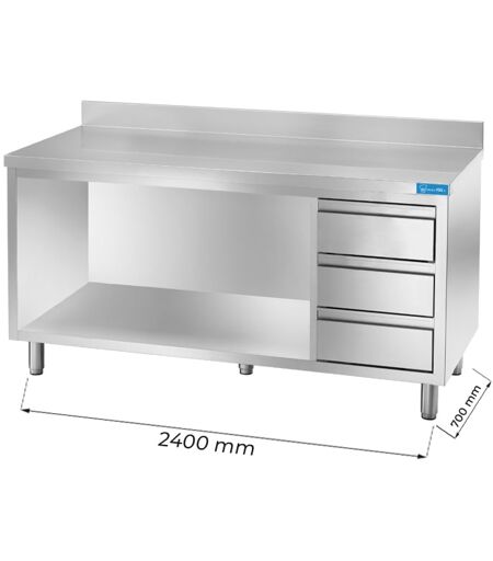 Tavolo a giorno in acciaio inox con 3 cassetti verticali a destra con alzatina L2400xP700xH850 mm linea basic