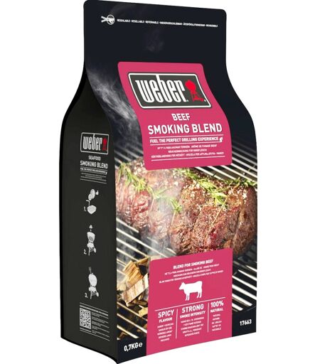 I chip per affumicatura Beef di Weber sono fatti di una miscela accuratamente selezionata per affumicare la carne di manzo. È composta da legno di noce, legno di latifoglie e legno di albero da frutto e conferisce ai piatti di carne di manzo una nota molto speciale. Sono ideali per il filetto di manzo, la punta di petto di manzo o gli hamburger. Producono un aroma speziato con una intensità di fumo forte. La confezione contiene 700 g. ...