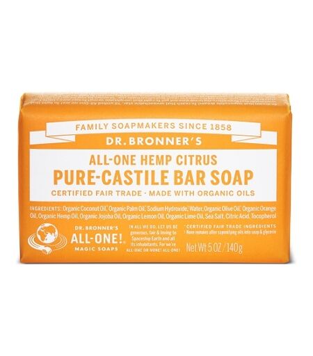 DR. BRONNER'S ALL - ONE HEMP CITRUS PURE - CASTILE BAR SOAP CERTIFIED FAIR TRADE - MADE WITH ORGANIC OILS Con olio biologico di arancia, limone e lime. Prodotto con ingredienti certificati del commercio equo e l'olio di canapa biologico per una morbida schiuma che non secca la pelle. Biodegradabile… ...
