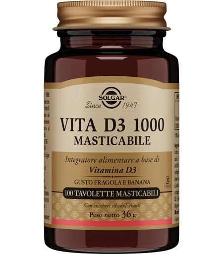 VITA D3 1000 - MASTICABILE - Descrizione Integratore alimentare a base di vitamina D3. La vitamina D contribuisce alla normale funzione del sistema immunitario, al mantenimento della normale funzione muscolare e al mantenimento di ossa e denti normali. Gusto fragola e banana. Con zuccheri ed edulco… ...
