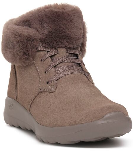 stile rilassato e comfort accogliente si uniscono in skechers on-the-go joy - cozy haven. questo polacchino pull-on per il freddo presenta una tomaia in pelle scamosciata trattata con scotchgarda(r) con colletto in pelliccia sintetica lacci elastici ...