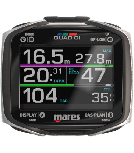 Immergiti nelle funzionalità avanzate di questo computer subacqueo Mares con integrazione dell´aria per un´esperienza subacquea senza precedenti. Personalizzabile con l´algoritmo Buhlmann ZH-L16C, il Mares QUAD Ci consente ai subacquei di impostare fattori di gradiente personalizzati, garantendo un´immersione sicura e su misura per le proprie preferenze. Con modalità versatili che comprendono aria, nitrox e trimix, abbinate a un display MIP ad alta risoluzione a 8 colori, questo computer subacqueo fornisce informazioni complete a colpo d´occhio. La bussola digitale integrata, il cronometro e l´integrazione dei dati del serbatoio senza tubo (fino a cinque trasmettitori) migliorano le capacità di navigazione e monitoraggio. Approfitta di un pianificatore di immersioni in decompressione, una capacità del logbook di 100 ore e un sistema intelligente di gestione della batteria che offre 20 ore di immersione per ogni ricarica completa. Rimani connesso tramite Bluetooth, accedi a informazioni sull´immersione in tempo reale e aggiorna comodamente il firmware tramite l´app Mares. Funzionalità di sicurezza come TTR e un allarme di deco in fuga consolidano ulteriormente questo computer subacqueo come un compagno affidabile per l´esplorazione subacquea.Caratteristiche:- Algoritmo Bühlmann ZH-L16C personalizzabile: adatta l´immersione con fattori di gradiente personalizzati, garantendo un´esperienza subacquea sicura e unica- Funzionalità di decompressione avanzate: esplora fattori di gradiente alternativi e la decompressione a soffitto per una maggiore sicurezza durante le immersioni- Modalità di immersione versatili: dall´aria al nitrox, trimix e profondimetro, questo computer subacqueo si adatta a vari profili di immersione, offrendo una flessibilità senza pari- Display MIP ad alta risoluzione: immergiti in un display MIP a 8 colori ad alta risoluzione, che presenta informazioni di grandi dimensioni per una leggibilità immediata- Bussola digitale integrata: naviga in sicurezza utilizzando la bussola digitale con inclinazione completa, completa di memoria dei cuscinetti e cronometro- Integrazione dati serbatoio senza fili: collega fino a cinque trasmettitori per un´integrazione dati serbatoio senza interruzioni, con livelli di pressione e saturazione codificati a colori- Pianificatore di immersioni con decompressione: pianifica le tue immersioni con precisione utilizzando il pianificatore di immersioni con decompressione, accompagnato da un´ulteriore funzione di intervallo di superficie- Capacità del registro: registra fino a 100 ore di profili di immersione con una frequenza di campionamento di 5 secondi, consentendo un´analisi completa post-immersione- Gestione intelligente della batteria: goditi un tempo di immersione di 20 ore per ogni ricarica completa (30 ore senza trasmettitore) con un sistema di gestione intelligente della batteria- Praticità di ricarica: ricarica senza sforzo tramite clip e cavo USB, con 500 cicli di ricarica che garantiscono... ...
