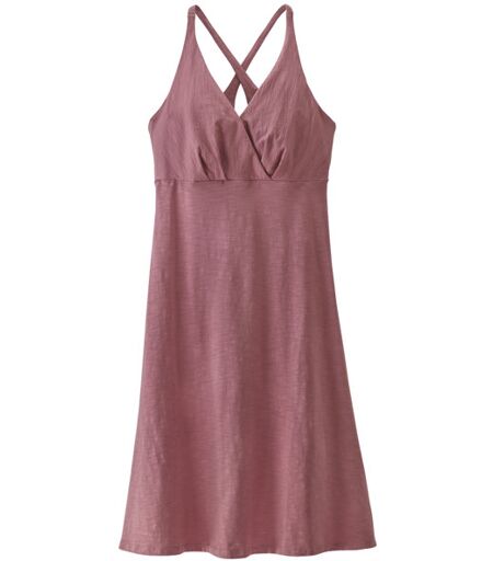 Patagonia Amber Dawn W vestito da donna, fresco e traspirante, rende confortevoli anche le giornate più calde. Realizzato in morbidissimo tessuto jersey di cotone biologico combinato ad un 4% di spandex per donare elasticità e favorire una perfetta libertà di movimento. in morbidissimo jersey di cotone organico tessuto a maglia leggera traspirante, elastico e fresco corpetto imperiale con fascia sotto al seno per un ottimo sostegno scollo a V e spalline incrociate sulla schiena gonna a campana sopra al ginocchio produzione Fair Trade Certified™ ...