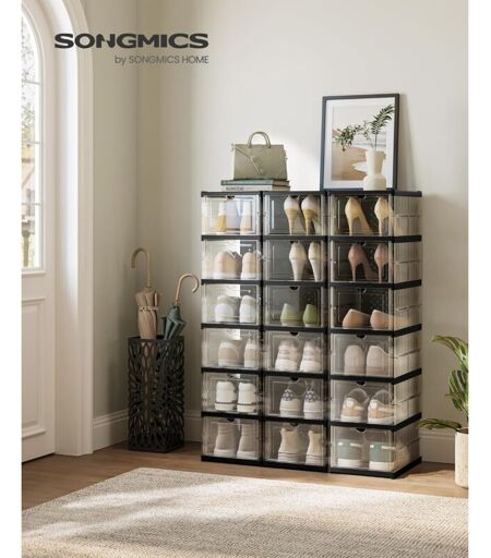 SONGMICS - Scatole per Scarpe, Set di 18 Organizzatori Porta Scarpe Impilabili, 3 Scarpiere Pieghevoli e Componibili, per Fino alla Taglia 46,