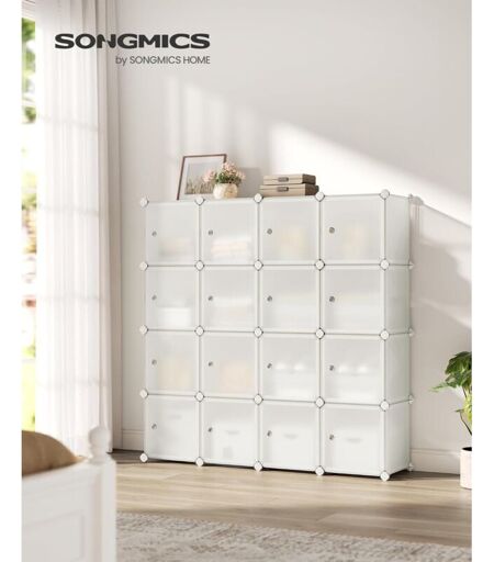 SONGMICS - Armadio a 16 Cubi, Portaoggetti Organizzatore, Armadietto Mobiletto con Ante, per Abiti Scarpe Libri, Facile da Assemblare, Bianco Crema