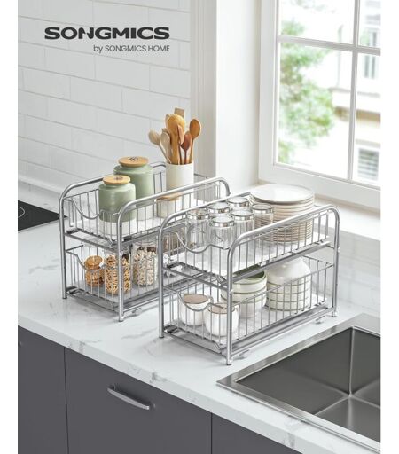 SONGMICS Set di 2 Organizzatori da Cucina, Scaffali a 2 Ripiani Estraibili per Armadietto, Organizzatore Impilabile Sottolavello con Cassetti Portaoggetti,