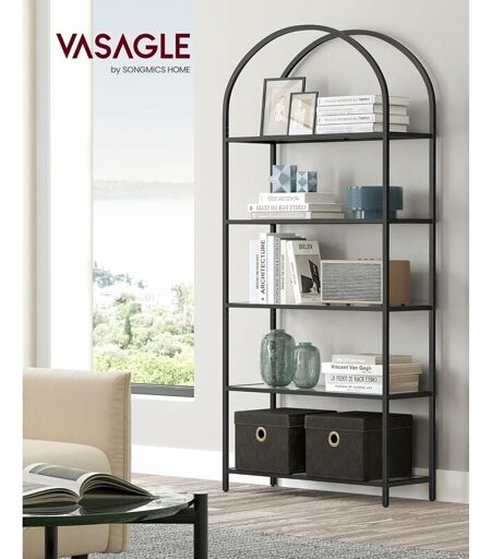 SONGMICS VASAGLE Scaffale Portaoggetti a 5 Ripiani, Libreria Scaffale in Vetro Temperato, Design ad Arco, Struttura in Metallo, per Soggiorno Camera da Letto