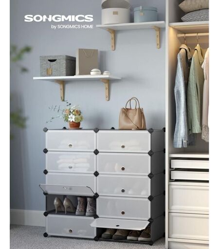 SONGMICS - Scarpiera a 10 Scomparti, Scaffale Componibile in Plastica, Armadietto Portascarpe Fai da Te con Ante e Martelletto, Mobiletto Porta