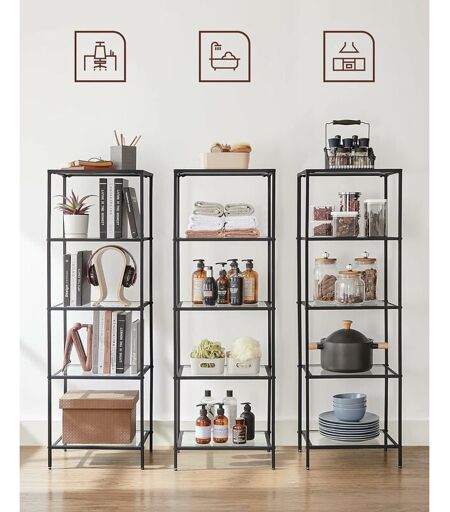 SONGMICS VASAGLE Scaffale in Vetro a 5 Ripiani, Liberia, Organizzatore Portaoggetti, Vetro Temperato, Facile da Montare, per Bagno Soggiorno Camera da Letto