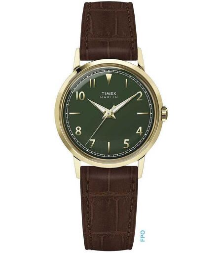 Orologio Da Unisex Di Timex Della Collezione Marlin. La Cassa È Realizzata In Acciaio Inossidabile E Misura 34 Mm Con Uno Spessore Di 10 Mm. La Cassa È Di Colore Oro E Di Forma Rotonda Con Finitura Lucida. Il Quadrante È Di Colore Verde E Il Display È ...