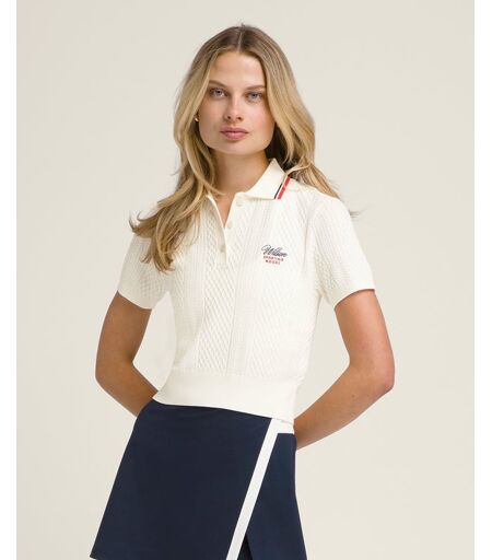A shrunken version of Wilson's best-selling sweater polo, this Cable Knit Shrunken Essex Polo is fully fashioned with allover cable-knit yarns capped by a striped, ribbed polo collar that retains its shape and complements a classic three-button placket. The wide, ribbed hem band snugs around your waist for a flattering fit that pairs perfectly with a tennis skirt. ...